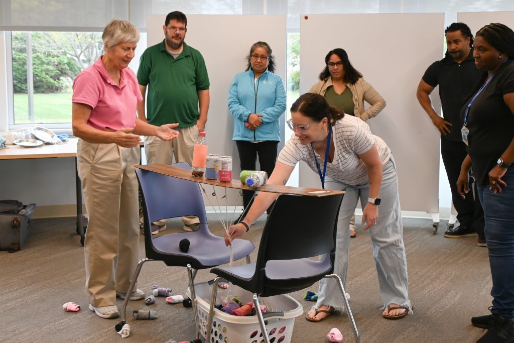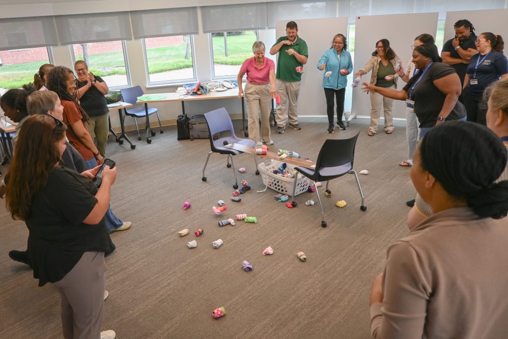 Movement in action! Dr. Diana Craft, nationally renowned trainer, demonstrates movement and physical activity techniques for children to DIEEC staff, focusing on easy, low-equipment activities for classrooms and homes. (Image by Christian S. Ferrell/DIEEC)