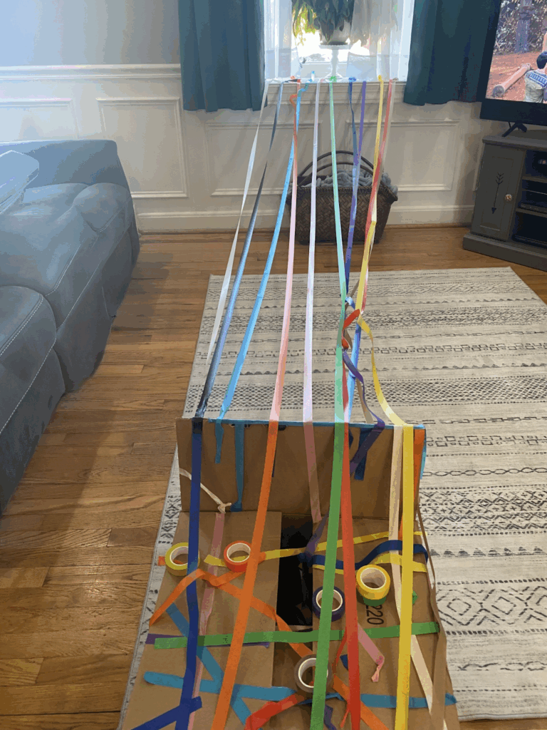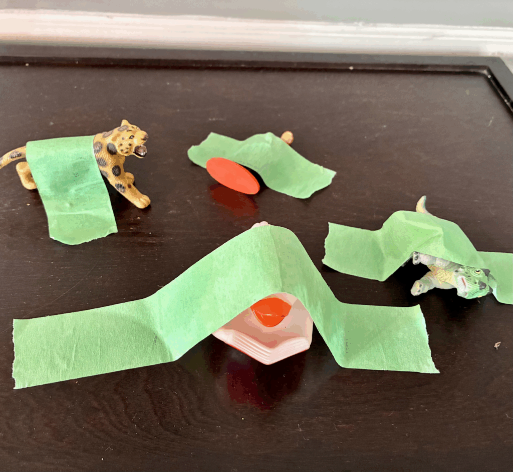 And finally, for preschoolers, you can give them the painter’s tape and some other materials and let them create their own activities. Below is a picture of the play that occurred when my children and a few friends had access to painter’s tape and a large box!