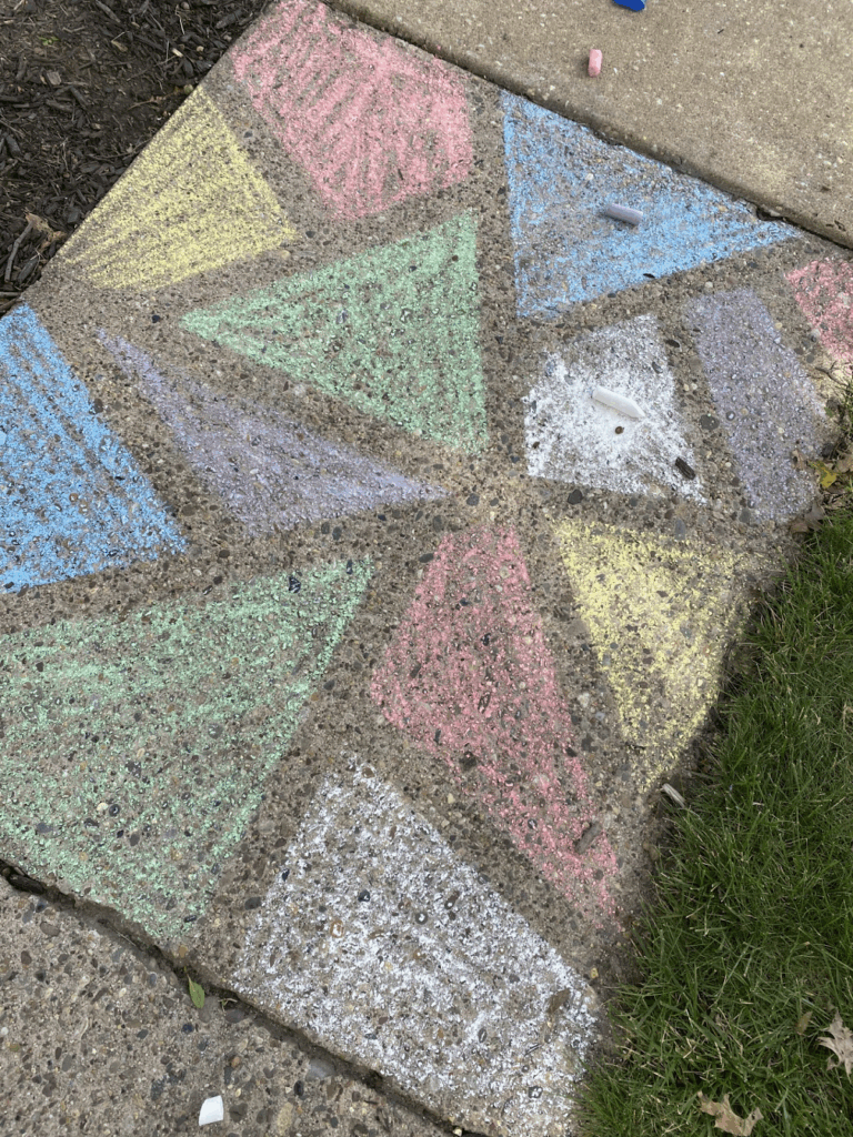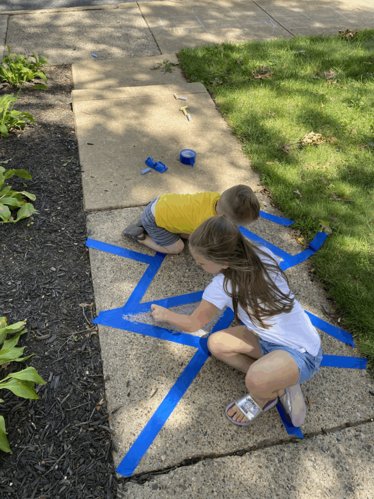 3. Abstract chalk art– Take your tape outdoors! Choose a large section of sidewalk or concrete and tape out different abstract shapes with the painter’s tape. Let the children color in the different shapes with sidewalk chalk. Then, let them pull up the tape to reveal a cool design.