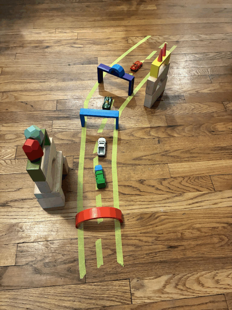5. Town roads– Create roads with the painter’s tape. If possible, do this in a larger open area. Let the children use blocks to build houses and other buildings around the roads to make a town. Then, drive toy cars around the town!