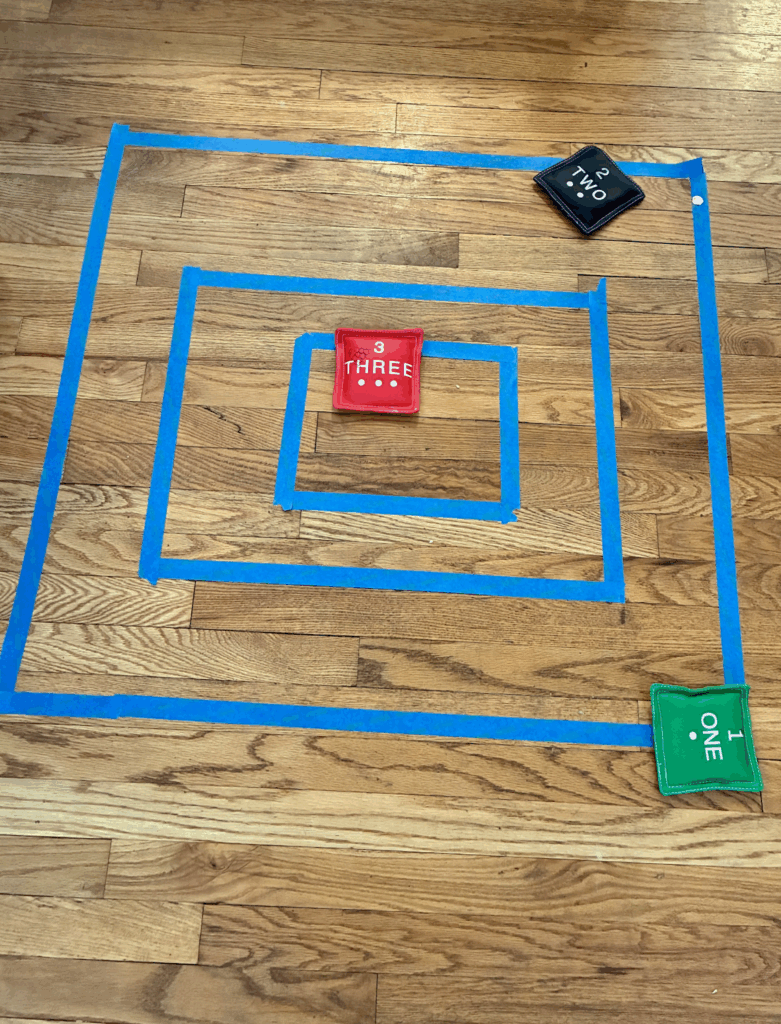 6. Hit the target– Create a target on the floor with painter’s tape. This can be done in a square since that is easier with the tape. Have the children throw bean bags and try to hit different spots on the target.